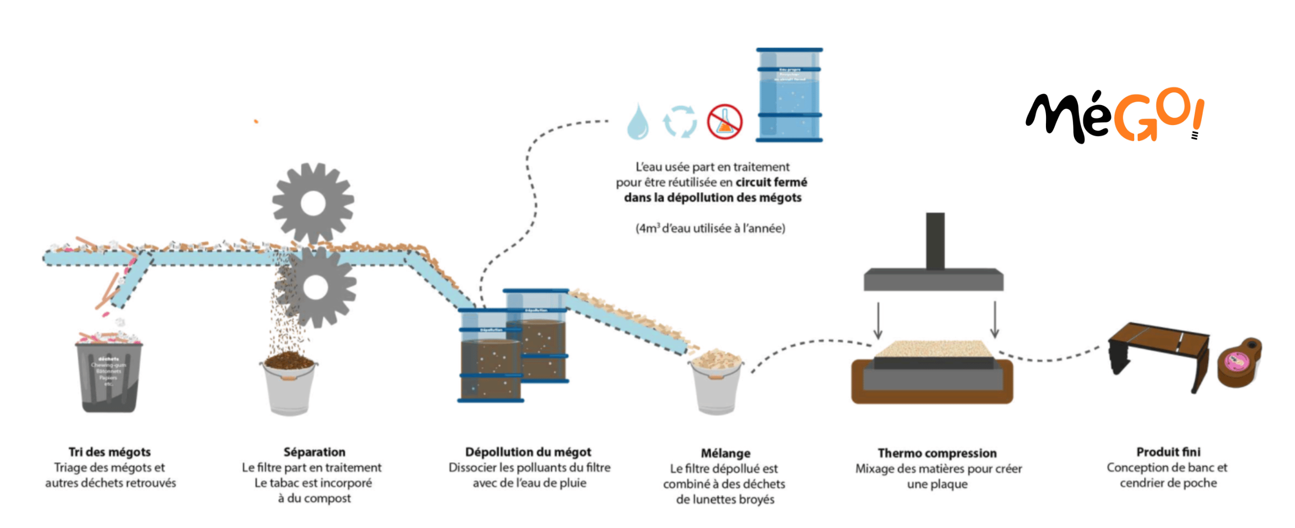 Ce recyclage exige toujours de séparer les différents composants du mégot, soit des matières organiques (reste de tabac), des matières plastiques polluées (le filtre acétate de cellulose). Le filtre est ensuite lavé avec de l’eau de pluie pour dissocier les polluants du reste. L’eau usée par en traitement pour être réutilisée en circuit fermé dans la dépollution des mégots.